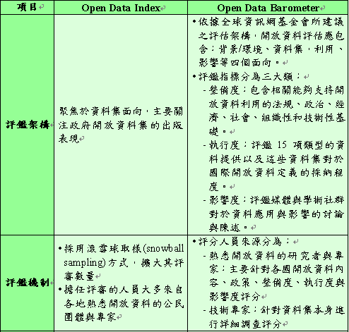 表4 全球開放資料指標(Open Data Index)與全球開放資料評估報告(Open Data Barometer)比較表