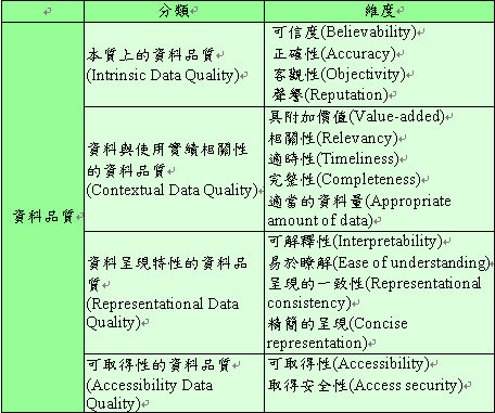 資料來源:Wang, R. Y., & Strong, D. M. (1996). Beyond Accuracy: What Data Quality Means to Data Consumers. Journal of Management Information Systems 12(4), pp 5–33.